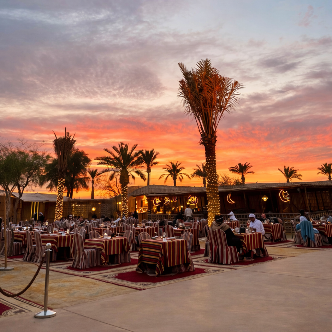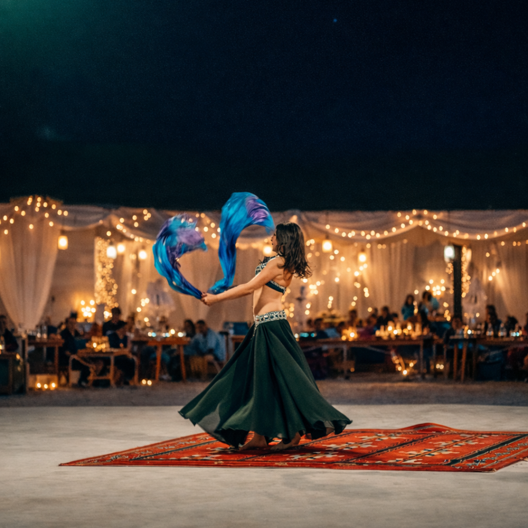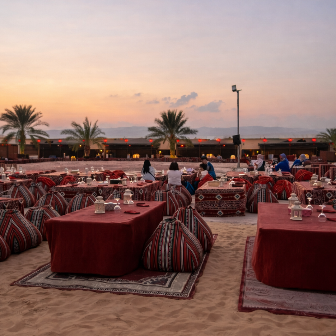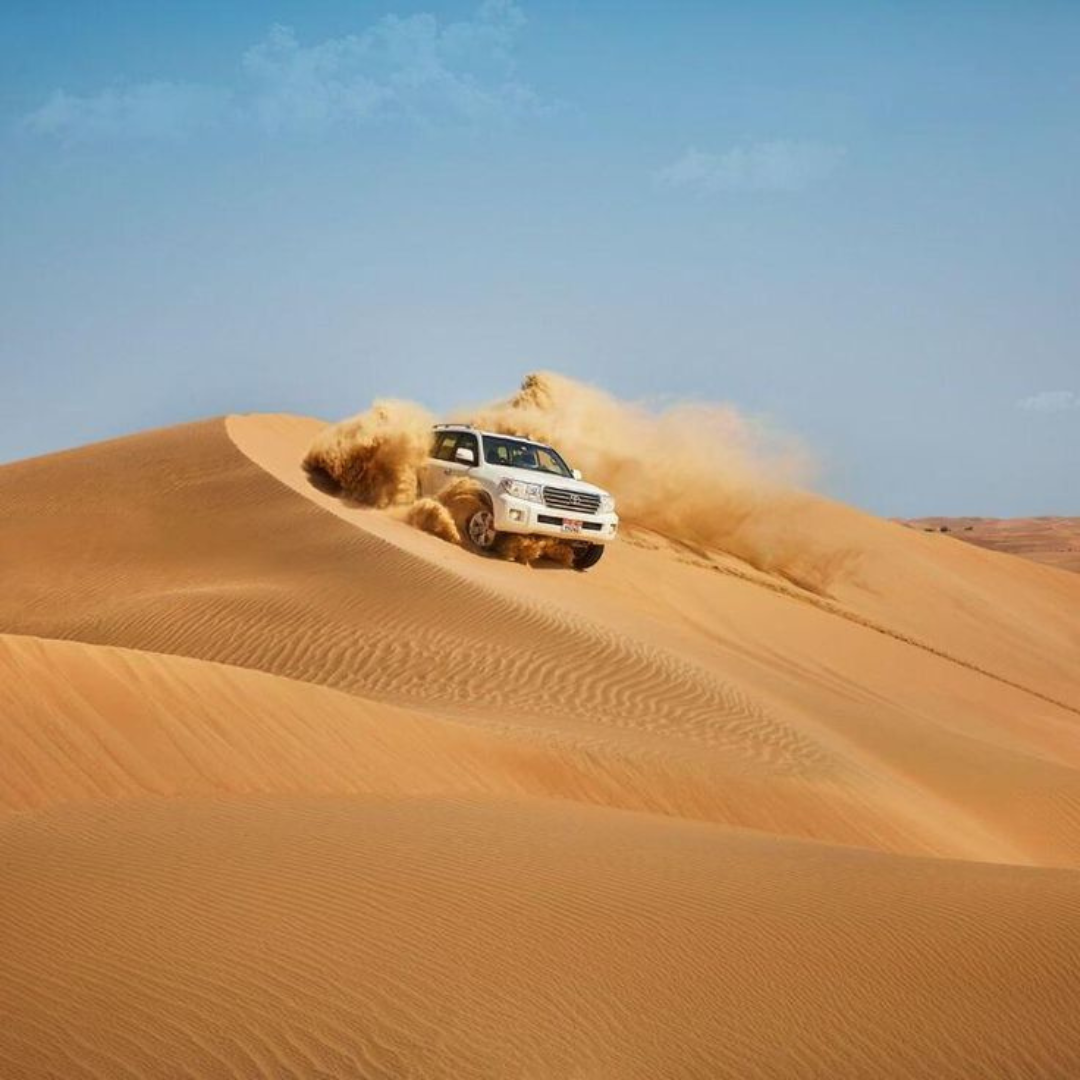 Included Services: Pickup/Drop • Dune Bashing • Camel Riding • Henna • BBQ Dinner • Belly Dance • Fire Show • Arabic Tanoora